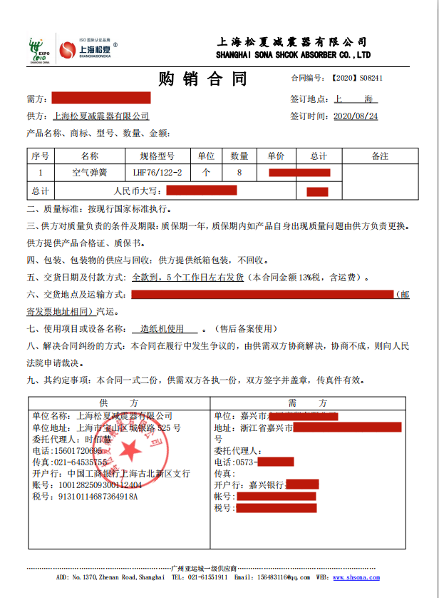 【造纸机配套】上海松夏空气弹簧合同介绍: