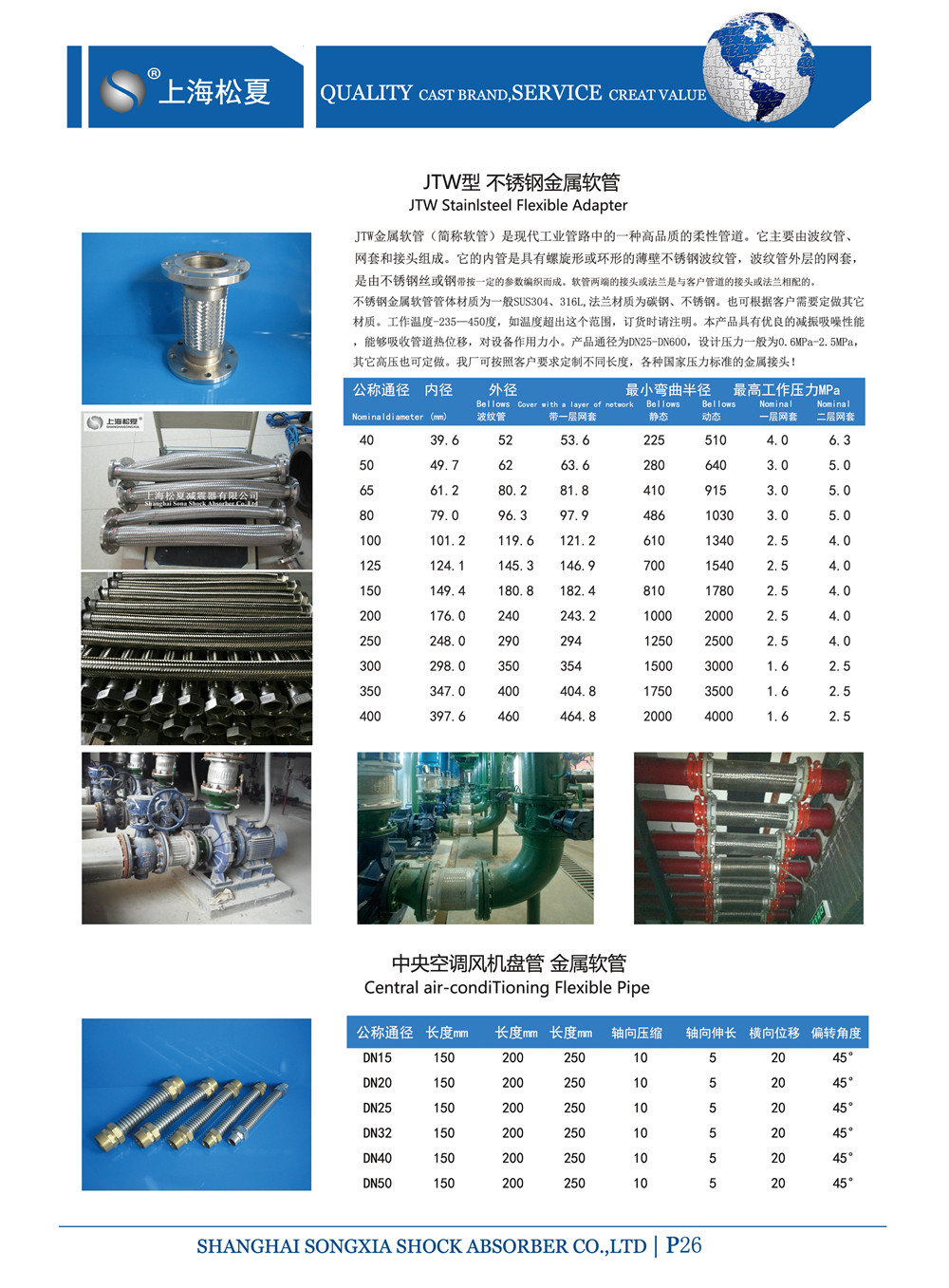 在工程中采用的泵和压缩机等设备在工作状态下,它们会产生振动和噪音,?;こ讨柿亢腿颂褰】?,金属软管具有良好的隔振,降噪作用,在泵和压缩机等设备进出口处安装一定长度的金属软管,可以减振、降噪、提高工程质量和使用寿命,但若盲目选用则不仅收不到良好效果,反而会使管路系统提前振坏。我们在借鉴国内外先进技术的基础上,结合产品实际使用状况,规划设计了泵用金属软管JTW系列,供工程设计和施工中选用。